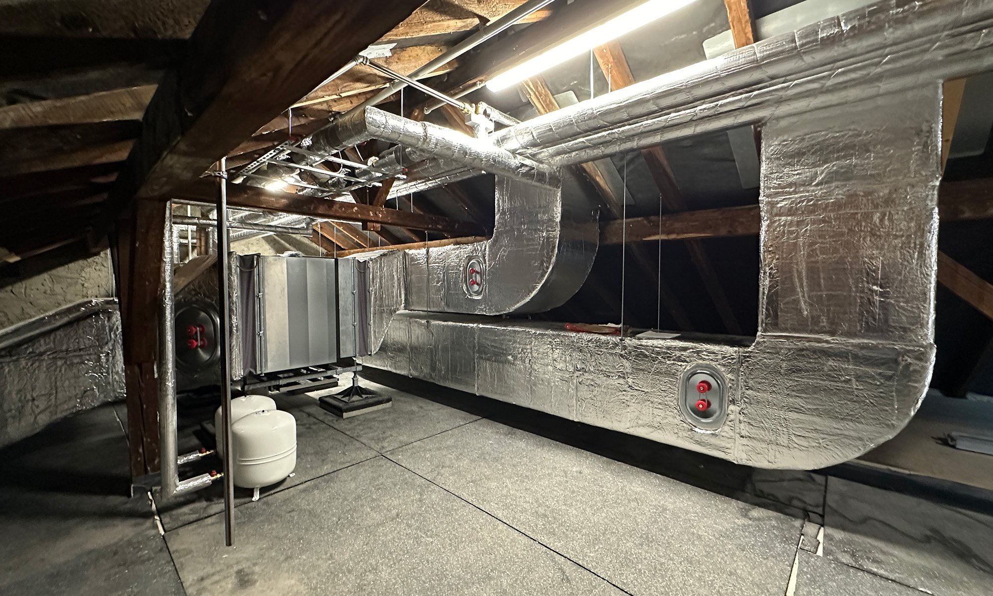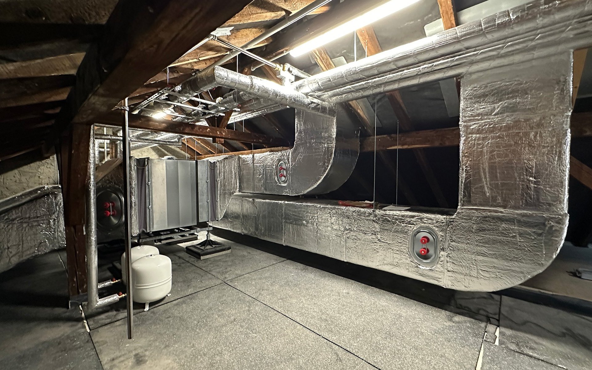 Besonders zukunftsweisend ist die neue Wärmeversorgung: Die Gebäude werden auf eine Luft-Wärme-Pumpe mit Spitzenlast-Gaskessel umgestellt. Die Anlage befindet sich – als Besonderheit dieses Projekts – im Dachbodenbereich. Auch die neue Heizzentrale, die im Rahmen eines Contracting-Modells durch die Firma Bautega betrieben wird, ist im Dachgeschoss installiert. Für die Warmwasserbereitung kommen wohnungsweise Stationen zum Einsatz. Ergänzend wird die Dacheindeckung erneuert und eine Photovoltaikanlage installiert. Abschließend werden die Außenanlagen überarbeitet.