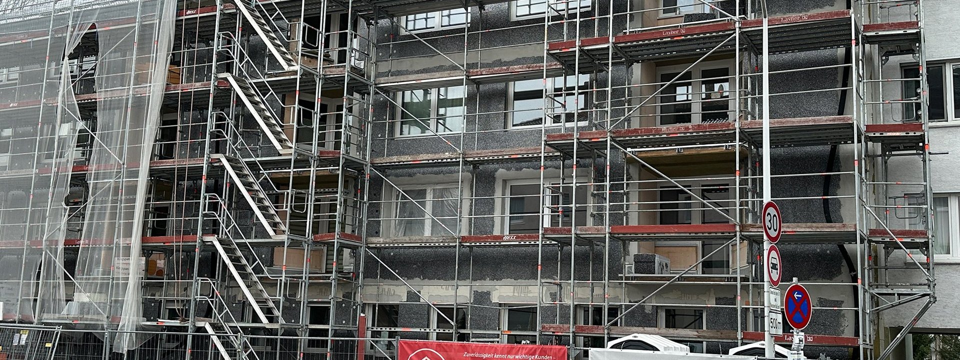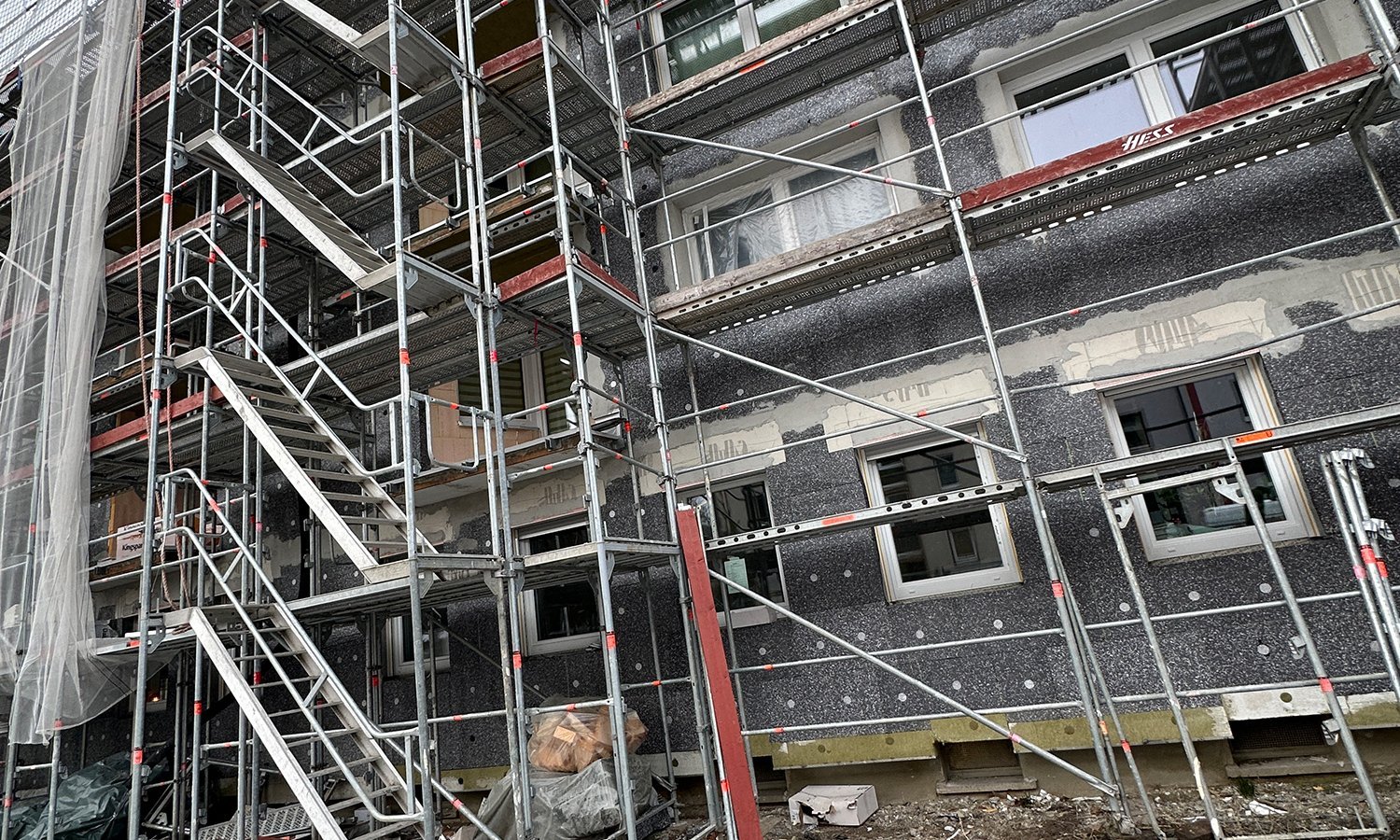 Die Arbeiten umfassen eine Vielzahl baulicher Maßnahmen: Nach der Schadstoffbeseitigung werden die Balkone saniert, inklusive neuer Beläge und moderner Geländer. Fassade, Dach und Kellerdecke erhalten eine zeitgemäße Dämmung, während bestehende Loggien in die neue wärmegedämmte Gebäudehülle integriert werden. Außerdem werden Fenster und Rollläden im Erdgeschoss sowie Haus- und Wohnungseingangstüren erneuert.